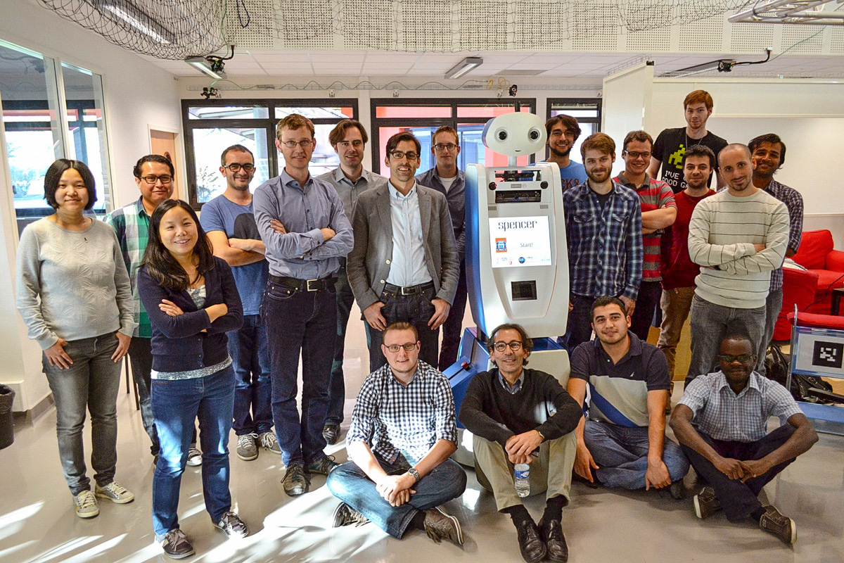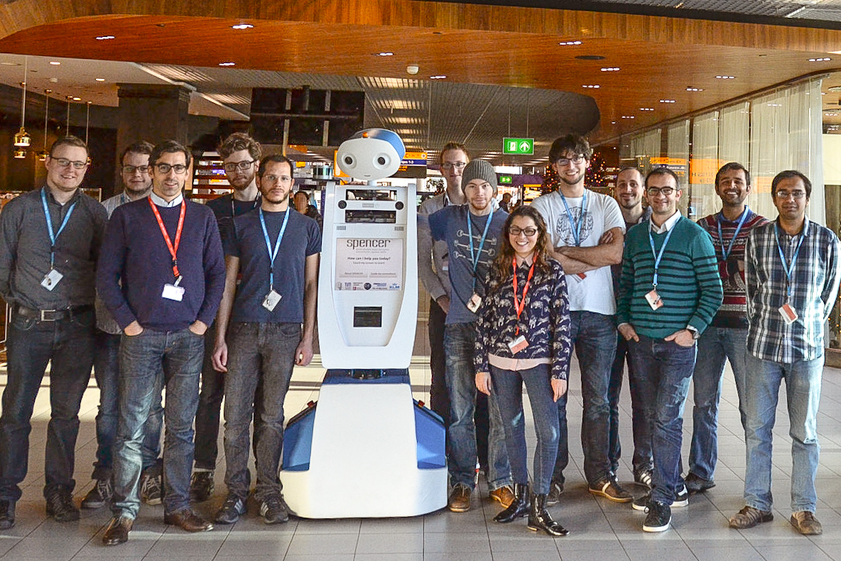 The aim of the 3-year EU FP7 research project SPENCER was to develop algorithms for service robots that can guide groups of people through highly dynamic and crowded pedestrian environments, such as airports or shopping malls, while behaving in a socially compliant manner by e.g. not crossing in between families or couples. As a PhD student in this project, my main research focus was on human & group detection and tracking in 2D laser range and RGB-D data, as well as full-body real-time human attribute classification in RGB-D. I was also heavily involved in the overall system integration of the custom robot platform, which is equipped with two front- and two rear-facing RGB-D sensors, two 2D laser scanners, a stereo camera pair and 5 onboard computers. A very successful deployment of the prototype at Amsterdam-Schiphol over several weeks took place in March 2016.